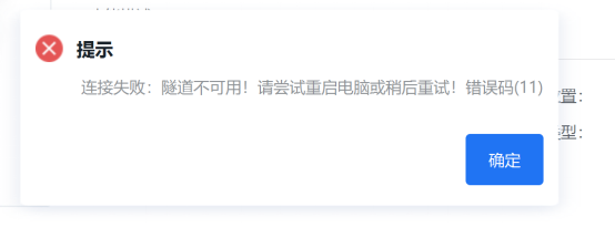 错误码11:提示“连接失败:隧道不可用!请尝试重启电脑或稍后重试!错误码(11)”。